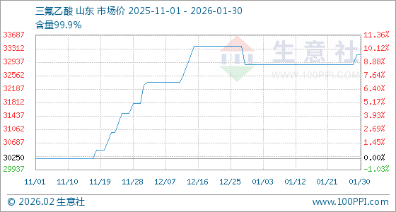 1月30日,生意社三氟乙酸基准价为33150.00元/吨,与本月初(32875.00元/吨)相比,上涨了0.84%。