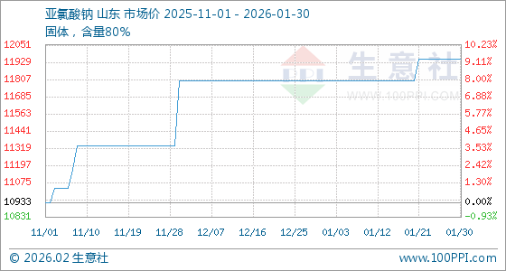 1月30日,生意社亚氯酸钠基准价为11950.00元/吨,与本月初(11800.00元/吨)相比,上涨了1.27%。