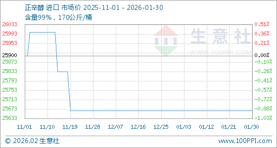 1月30日,生意社正辛醇基准价为25666.67元/吨,与本月初持平。
