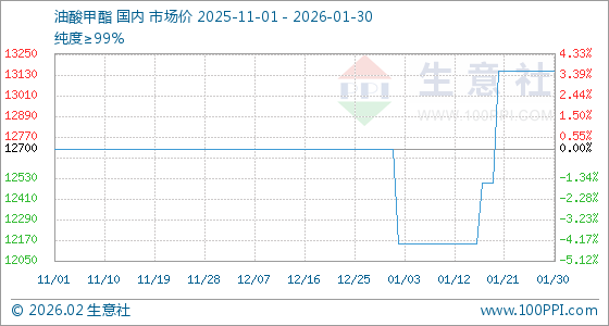 1月30日,生意社油酸甲酯基准价为13150.00元/吨,与本月初(12700.00元/吨)相比,上涨了3.54%。