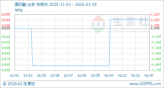 1月30日,生意社酒石酸基准价为10250.00元/吨,与本月初(10166.67元/吨)相比,上涨了0.82%。