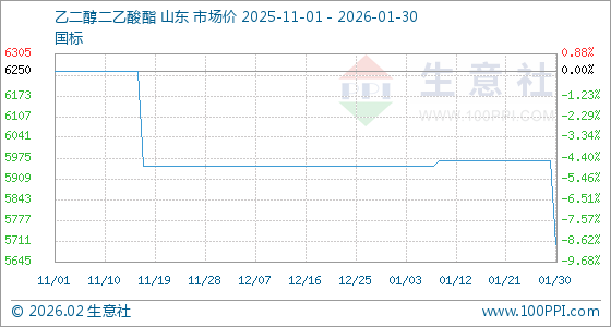 1月30日,生意社乙二醇二乙酸酯基准价为5966.67元/吨,与本月初(5950.00元/吨)相比,上涨了0.28%。