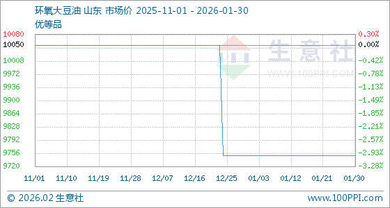 1月30日,生意社环氧大豆油基准价为9750.00元/吨,与本月初持平。