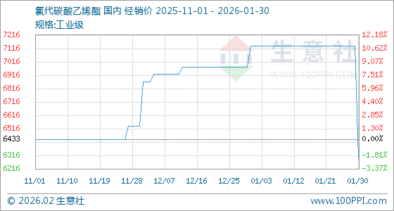 1月30日,生意社氯代碳酸乙烯酯基准价为7133.33元/吨,与本月初持平。