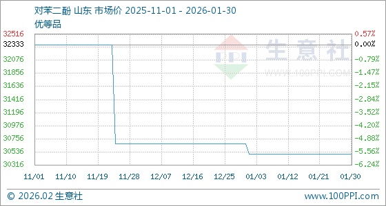 1月30日,生意社对苯二酚基准价为30500.00元/吨,与本月初(30666.67元/吨)相比,下降了0.54%。