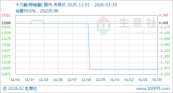 1月30日,生意社十六酸(棕榈酸)基准价为13000.00元/吨,与本月初持平。
