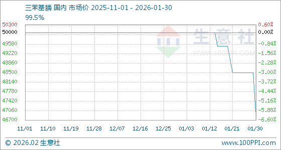 1月30日,生意社三苯基膦基准价为48500.00元/吨,与本月初(50000.00元/吨)相比,下降了3%。
