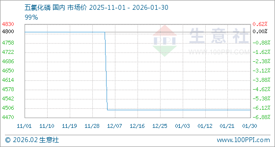 1月30日,生意社五氯化磷基准价为4500.00元/吨,与本月初持平。