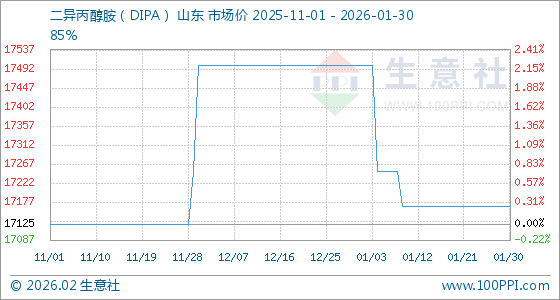 1月30日,生意社二异丙醇胺(DIPA)基准价为17166.67元/吨,与本月初(17500.00元/吨)相比,下降了1.9%。