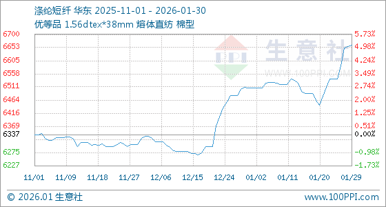 1月30日,生意社涤纶短纤基准价为6660.91元/吨,与本月初(6507.33元/吨)相比,上涨了2.36%。