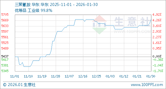 1月30日,生意社三聚氰胺基准价为5650.00元/吨,与本月初(5637.50元/吨)相比,上涨了0.22%。