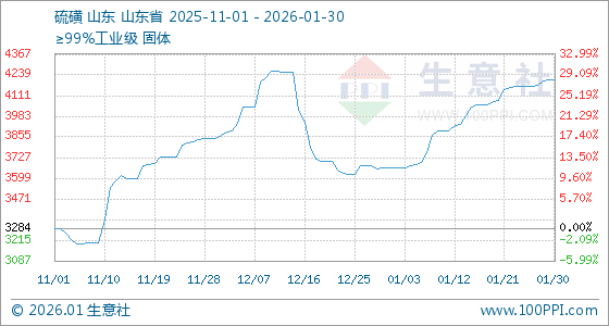 1月30日,生意社硫磺基准价为4210.00元/吨,与本月初(3661.00元/吨)相比,上涨了15.00%。
