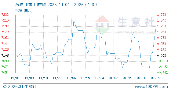 1月30日,生意社汽油基准价为7192.80元/吨,与本月初(7114.60元/吨)相比,上涨了1.10%。