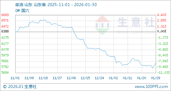 1月30日,生意社柴油基准价为5854.40元/吨,与本月初(5961.00元/吨)相比,下降了1.79%。