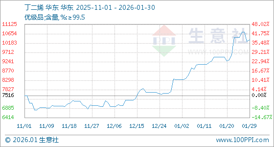 1月30日,生意社丁二烯基准价为10333.33元/吨,与本月初(8333.33元/吨)相比,上涨了24.00%。