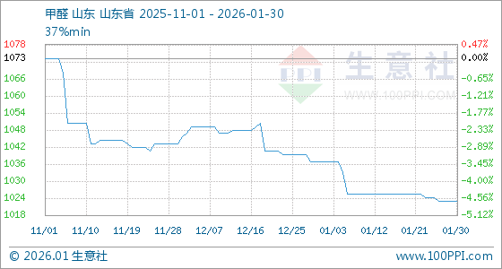 1月30日,生意社甲醛基准价为1023.75元/吨,与本月初(1037.50元/吨)相比,下降了1.33%。