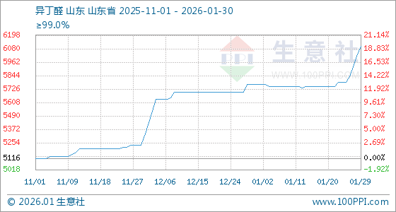 1月30日,生意社异丁醛基准价为6100.00元/吨,与本月初(5766.67元/吨)相比,上涨了5.78%。