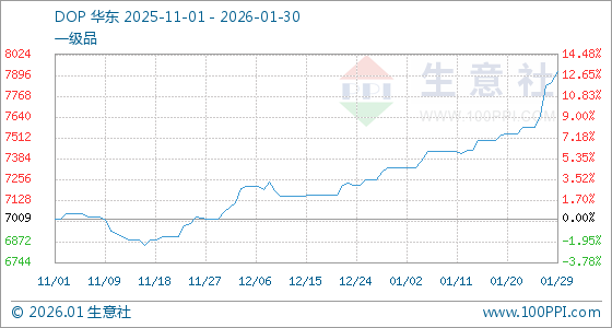 1月30日,生意社DOP基准价为7917.50元/吨,与本月初(7325.84元/吨)相比,上涨了8.08%。