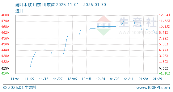 1月30日,生意社阔叶木浆基准价为4616.67元/吨,与本月初(4683.33元/吨)相比,下降了1.42%。