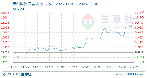 1月30日,生意社天然橡胶基准价为16450.00元/吨,与本月初(15341.67元/吨)相比,上涨了7.22%。