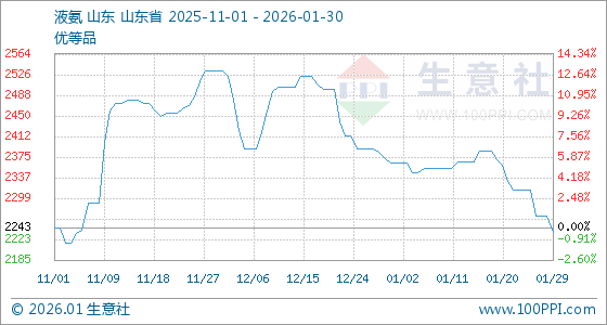 1月30日,生意社液氨基准价为2236.67元/吨,与本月初(2363.33元/吨)相比,下降了5.36%。