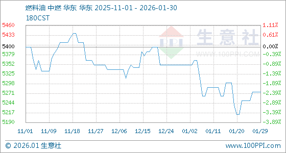 1月30日,生意社燃料油基准价为5275.00元/吨,与本月初(5350.00元/吨)相比,下降了1.4%。
