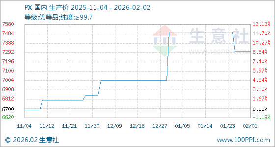 2月2日,生意社PX基准价为7300.00元/吨,与本月初持平。
