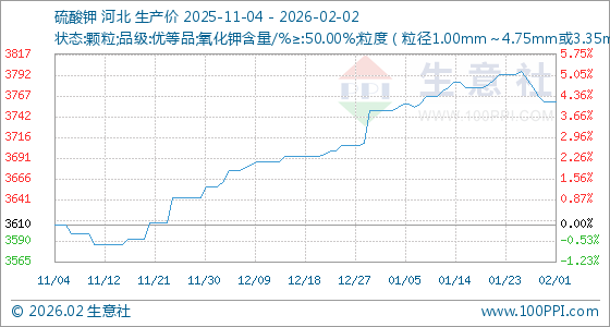 2月2日,生意社硫酸钾基准价为3760.00元/吨,与本月初持平。