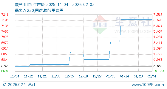 2月2日,生意社炭黑基准价为7200.00元/吨,与本月初持平。