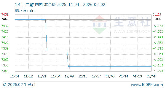2月2日,生意社1,4-丁二醇基准价为7357.14元/吨,与本月初持平。
