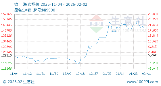2月2日,生意社镍基准价为146016.67元/吨,与本月初持平。