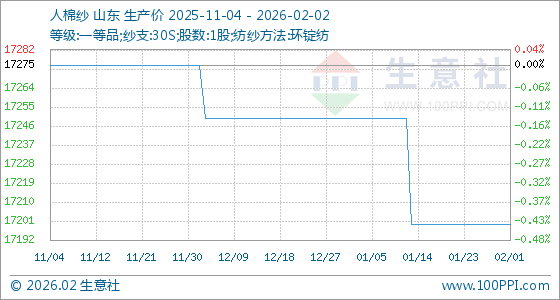 2月2日,生意社人棉纱基准价为17200.00元/吨,与本月初持平。
