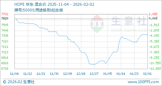 2月2日,生意社HDPE基准价为7337.50元/吨,与本月初持平。