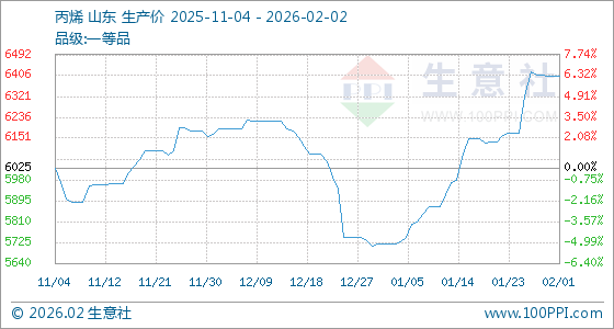 2月2日,生意社丙烯基准价为6404.33元/吨,与本月初持平。