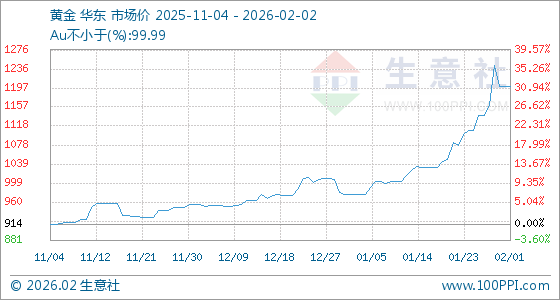 2月2日,生意社黄金基准价为1199.84元/克,与本月初持平。