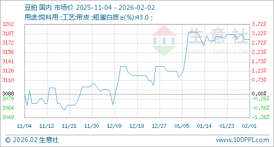 2月2日,生意社豆粕基准价为3178.00元/吨,与本月初持平。
