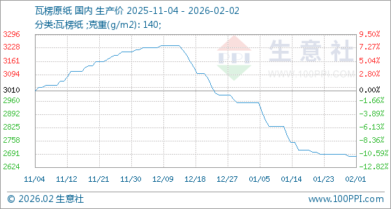 2月2日,生意社瓦楞原纸基准价为2680.00元/吨,与本月初持平。