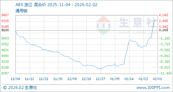 2月2日,生意社ABS基准价为9350.00元/吨,与本月初持平。