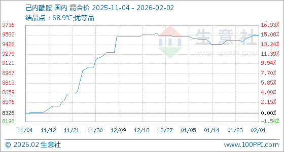 2月2日,生意社己内酰胺基准价为9573.33元/吨,与本月初持平。