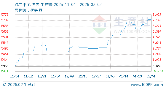 2月2日,生意社混二甲苯基准价为5740.00元/吨,与本月初持平。