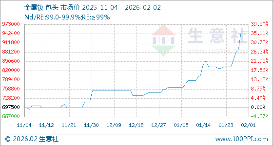 2月2日,生意社金属钕基准价为947500.00元/吨,与本月初持平。
