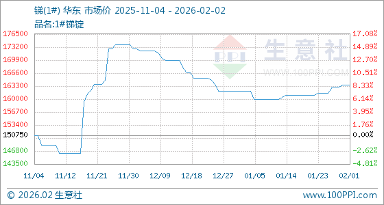 2月2日,生意社锑(1#)基准价为163500.00元/吨,与本月初持平。