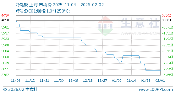 2月2日,生意社冷轧板基准价为3807.50元/吨,与本月初持平。