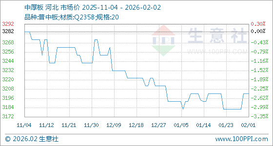 2月2日,生意社中厚板基准价为3202.00元/吨,与本月初持平。