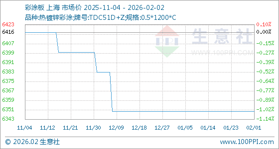 2月2日,生意社彩涂板基准价为6350.00元/吨,与本月初持平。