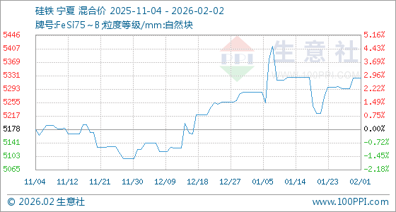 2月2日,生意社硅铁基准价为5324.29元/吨,与本月初持平。