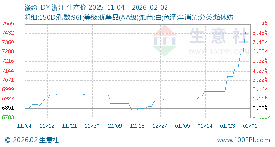 2月2日,生意社涤纶FDY基准价为7445.00元/吨,与本月初持平。