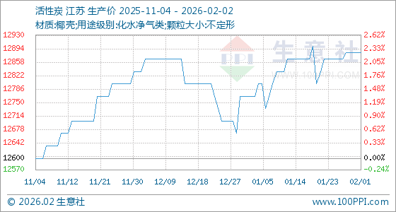 2月2日,生意社活性炭基准价为12883.33元/吨,与本月初持平。