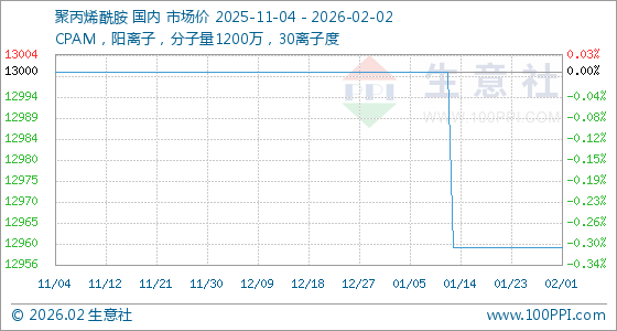 2月2日,生意社聚丙烯酰胺基准价为12960.00元/吨,与本月初持平。