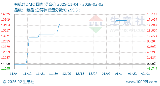 2月2日,生意社有机硅DMC基准价为13850.00元/吨,与本月初持平。
